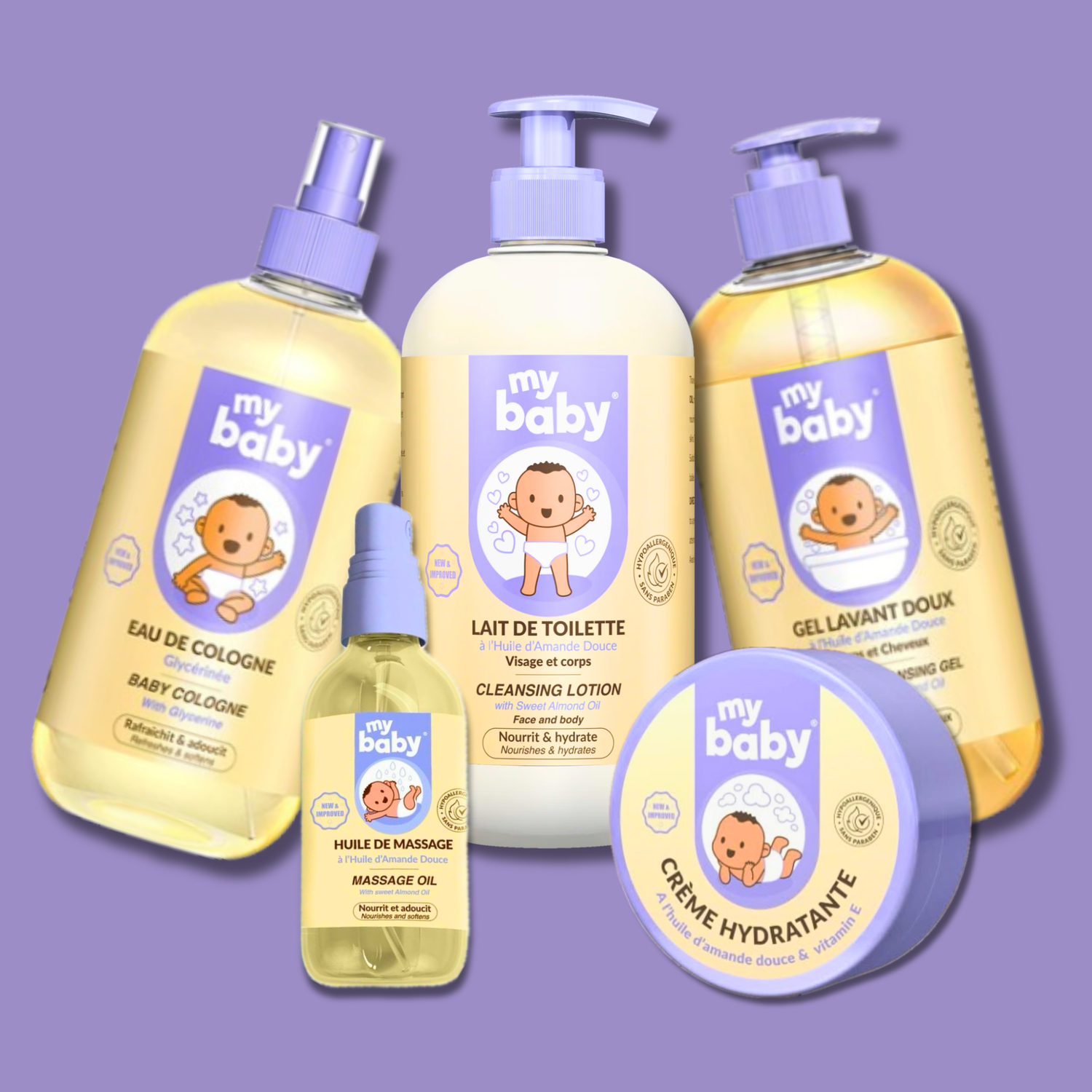 La gamme My Baby, à base d’huile d’amande douce et de beurre de karité, offre une solution 100 % naturelle pour la peau délicate de bébé.